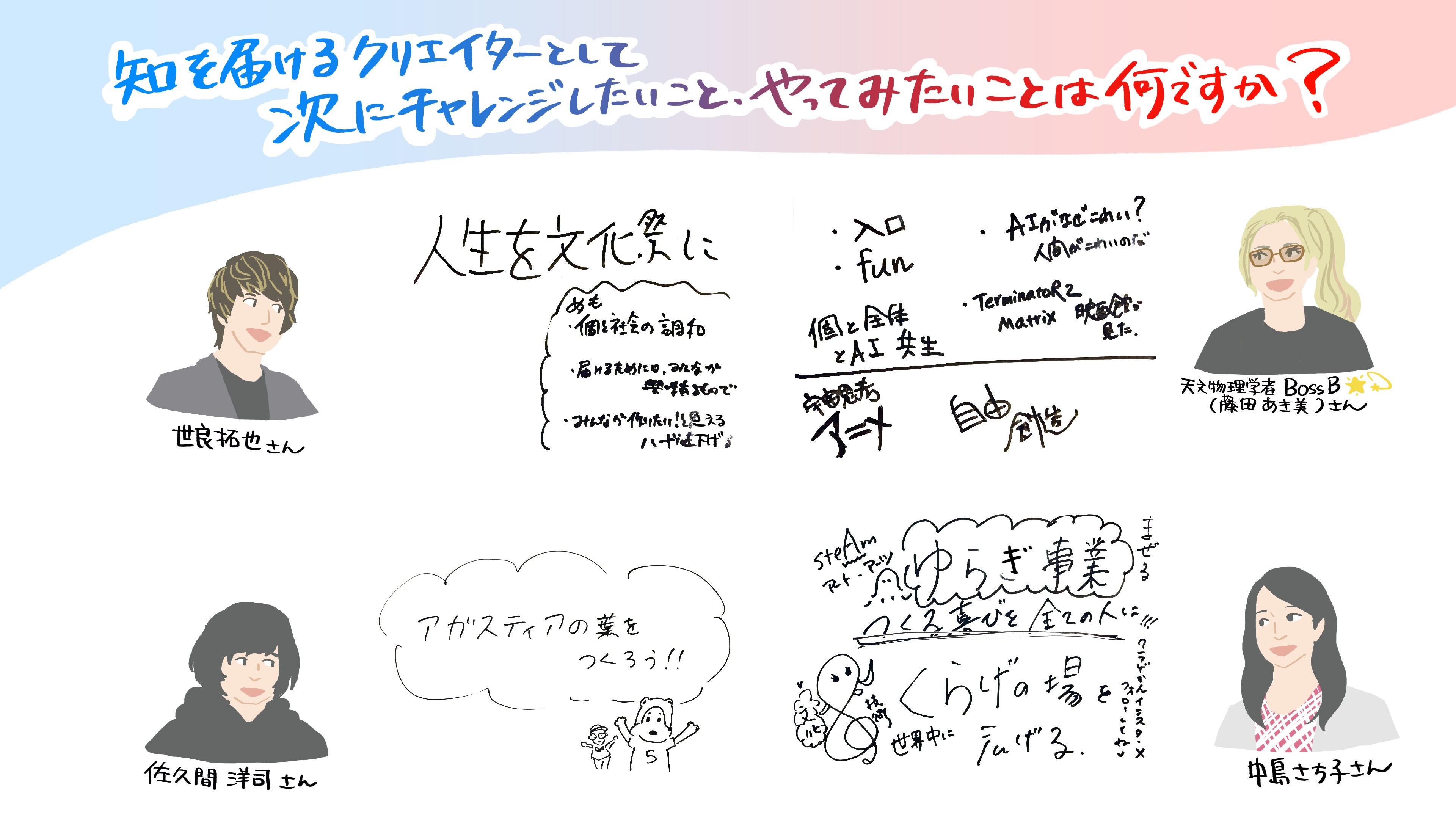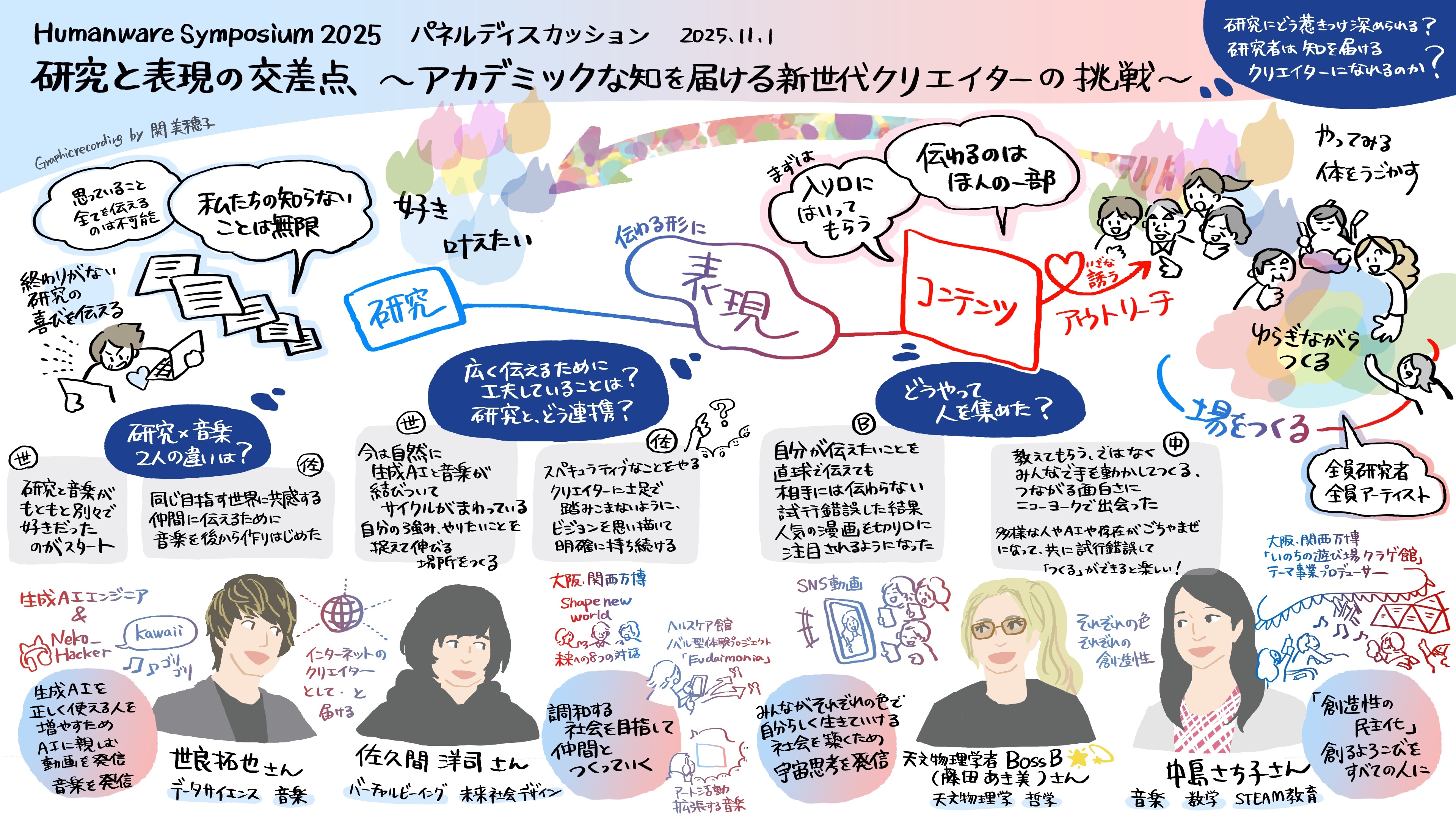 本パネルディスカッションでは、4名の登壇者とともに「自身の研究や作品をどのように人々に届けるか?」をテーマに議論しました。 1時間があっという間に感じられるほど、登壇者それぞれの想いや夢に触れる濃密な時間となり、会場は終始あたたかな熱気に包まれました。 登壇者との対話を通して見えてきたのは、「好き」「叶えたい」という強い気持ちでした。 その情熱こそが、人を惹きつけ、研究や表現を社会へとつなげていく原動力になっているのではないかと感じました。 また本セッションでは、アラワスの関さんにグラフィックレコーディングをしていただきました。 リアルタイムで描かれた1枚目の作品には議論の内容が色鮮やかに表現され、2枚目には登壇者の皆さんがそれぞれのメッセージを書き込んでくださいました。 その言葉の一つひとつには、未来への希望と新しい表現への意欲が込められていました。 研究と表現が交わることで生まれる新しい可能性を感じる、心に残るセッションとなりました。